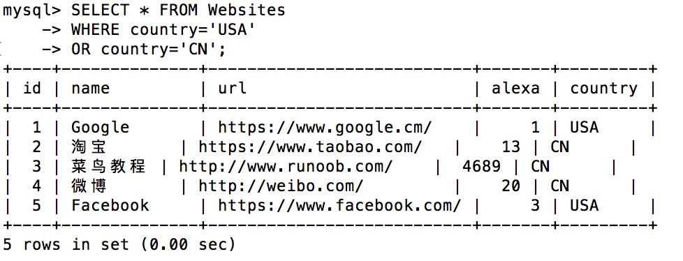 下面的 SQL 语句从 "Websites" 表中选取国家为 "USA" 或者 "CN" 的所有客户: